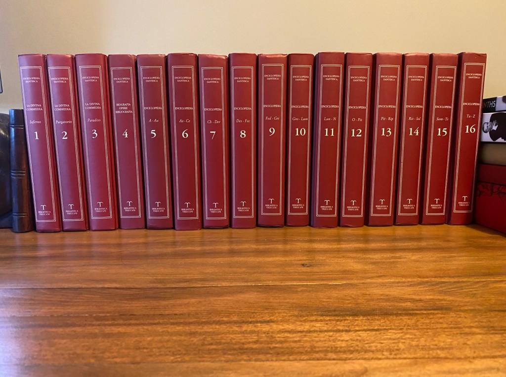 We all have dream books and this has long been one of mine. As I understand it, the notion of the current Enciclopedia Dantesca was born toward the end of the Second World War when the editor Umberto Bosco recognized the need for an update to the 1895 Enciclopedia Dantesca directed by Giovanni Andrea Scartazzini (digitized copies of which are available for view here). It took until 1965 – the 700th anniversary of Dante’s birth – for the project to gain enough interest to be put into production. Work then proceeded and between 1970 and 1977 six total volumes were published. These were revised and reprinted in 1984 (the revision seems mostly to have been an expanded bibliography), and that revision was itself reprinted in a limited run luxury edition in 1996 (which is the one I’ve had out from my library for 6? years). Then in 2005 the enciclopedia saw another revision, this time adding bibliography for 1985-2005 and at least retouching the biography (I don’t have the 1996 volume at hand to compare so I can’t be sure the extent). This latest printing, distributed across an impressive 16 volumes, is now in my personal library – though homeless until I shift about some other books. There is an online version here that includes everything but volumes 1-4 – the texts, commentary, biography, and bibliographies – but it’s not quite the same.