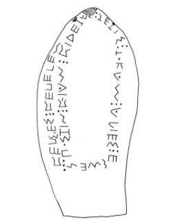 Notes. postin: ‘along’, Umbrian pustin. videtas: probably ‘you see’, 2nd pl., equivalent to Lat. videtis ‘you (pl.) see’; passers-by are the addressees. tetis alies: apparently the name, in the genitive, of the man buried there. tokam: cognate with Lat. togam (accus. sing.), but the exact sense is uncertain (‘covering’? The root is *(s)teg- ‘cover’). In many early Italic inscriptions k or c was used for voiced g. esmen: locative of the demonstrative stem e-, cp. Umbr. esme; superficially similar to Sanskrit asmin ‘in this’ but probably not of identical origin. It is thought to continue *esmeien, the earlier locative *esmei plus the postposition -en ‘in’. vepses: perhaps ‘buried’; unclear. It might be a past participle of the sort seen in Lat. lapsus ‘slipped’. vepeten: perhaps ‘tomb’, with locative in -en.