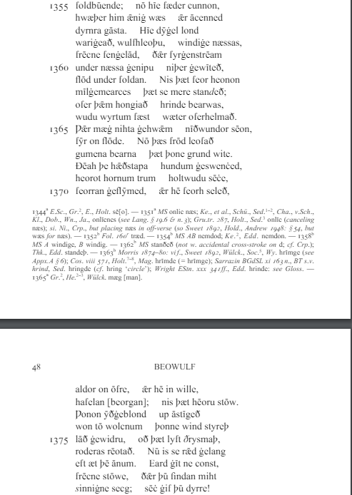 And the original from the standard Klaeber’s Beowulf (4th edition). Unsurprisingly WordPress doesn’t care for the unique Old English characters so a screenshot will have to suffice: