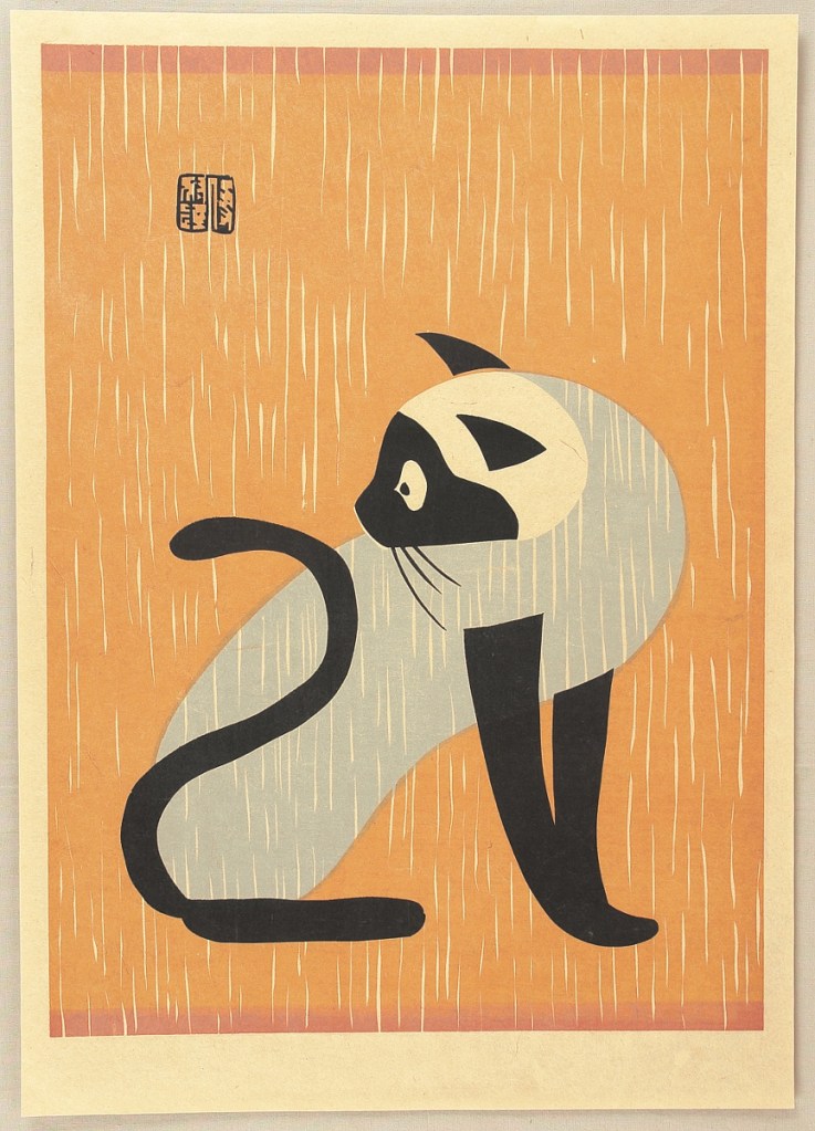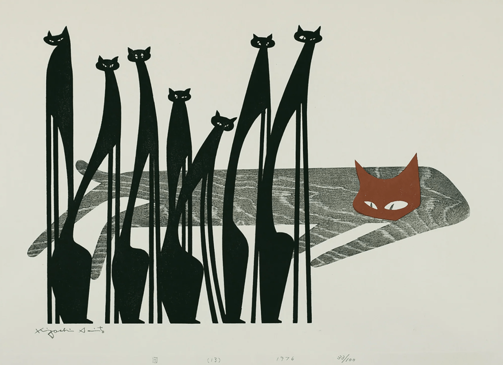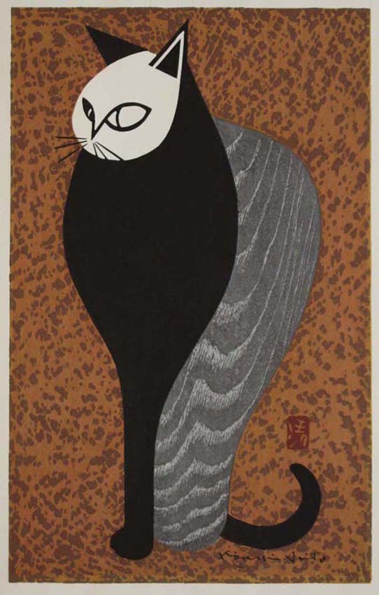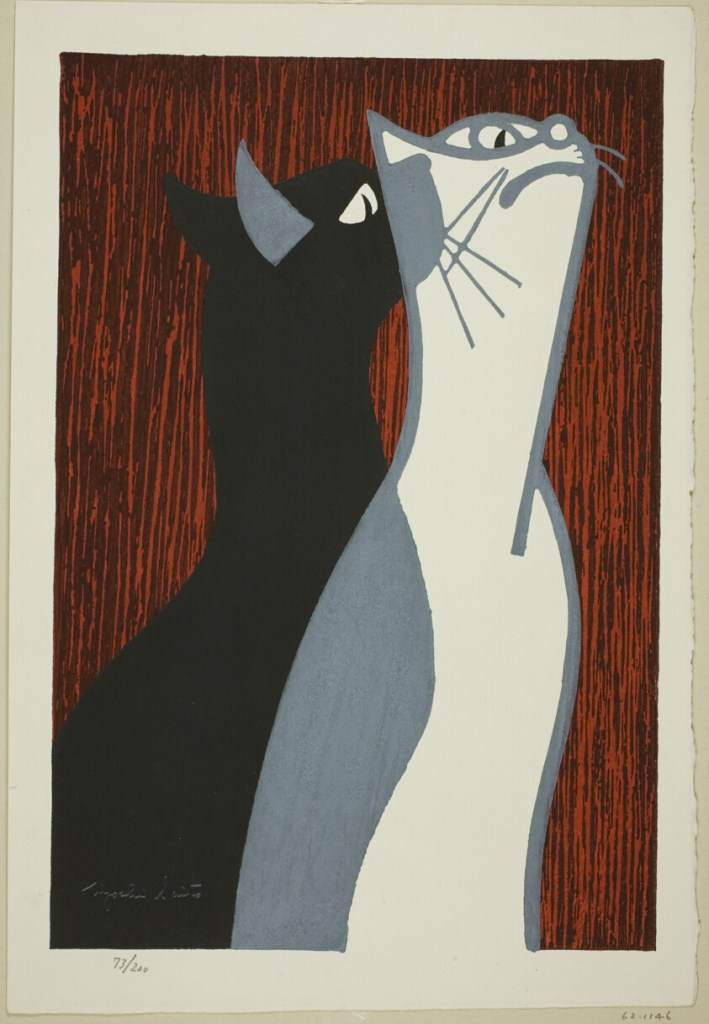 But here are some of his cats. There’s a clear progression from the less stylized earlier row (1940s-50s) to the hyper-elongated (sometimes owl-ish) geometrics of the second row (1950s-70s) and later back to something of a blend in the third row (1980s, though the right-hand piece is, as best I can tell, a late revision of an earlier one from the 1960s).