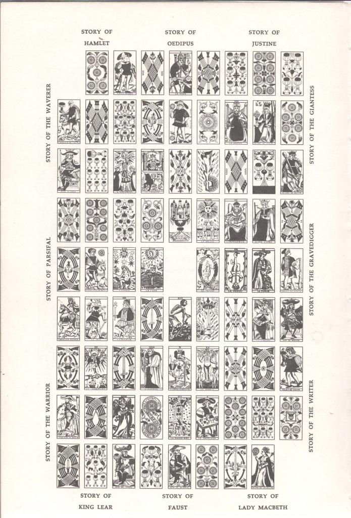 It’s probably either a trope I don’t recognize or a chance convergence of thought but this reminds me much of the notion behind Italo Calvino’s The Castle of Crossed Destinies. Either way, Calvino’s explanation of the formation of that work – in which characters, unable to speak, tell their tales through setting out Tarot cards and are given verbal interpretations by the narrator – is curious enough to deserve quoting. At bottom is an image of how this process played out: