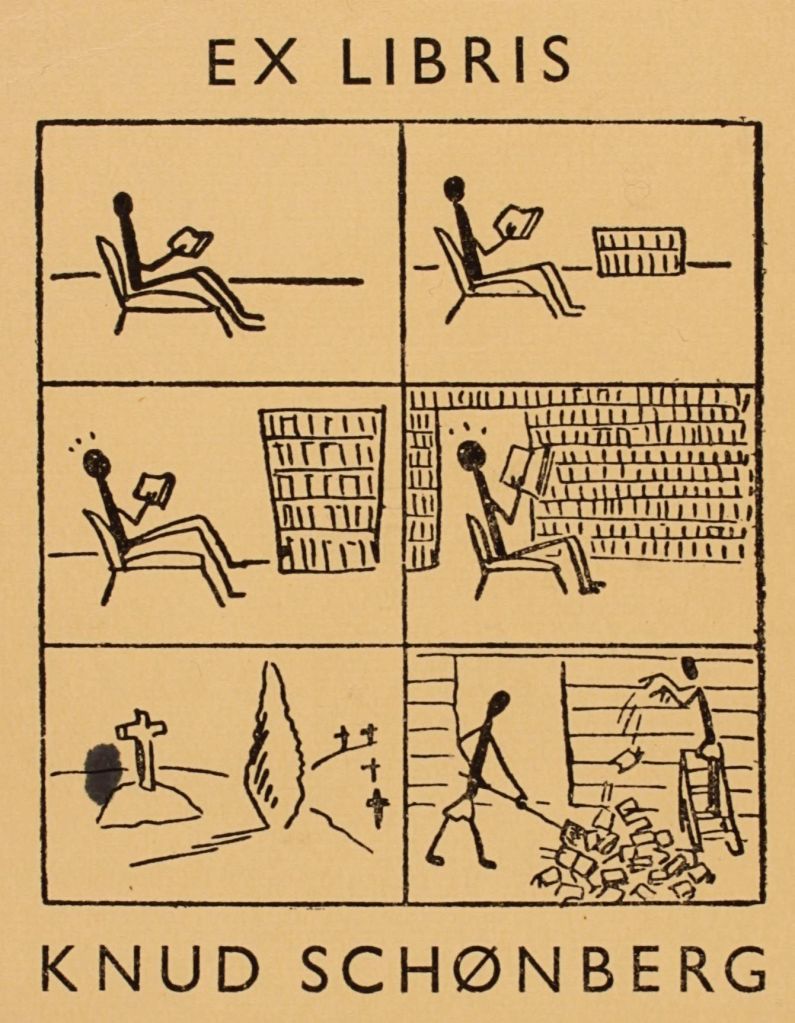 On vacation last week I went into a promising little used/antiquarian bookshop. Finding more Latin Teubners than a man has any right to expect of any store, I started checking for owner’s marks and discovered I’d been browsing the unwanted residue of an old professor’s personal library. This reminded me of the bookplate below, which I’d saved a few years back partly because I liked the spirit of the joke and partly because I knew it to be only half a joke. As I made room in my library this morning for new editions of Valerius Flaccus and Macrobius, the joke end of the scale seemed to lose weight.