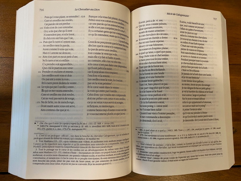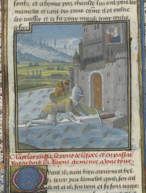 From the Burton Raffel translation of Chretien de Troyes’ Lancelot, The Knight of the Cart, Lancelot’s crossing of the sword bridge. An edition of the original text can be found here (~lines 3000-3125 given here). I can’t find a good collection of images online but this article plus a quick google image search will point to how iconic the scene became – though to me some of the representations (like the one below) take an accidental Boschian aspect from the artist’s realization that all you really need is a knight on a large knife (compare from Hell in Earthly Delights and the center panel in the Bruges Last Judgment).