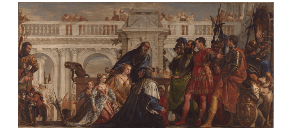 I’d been curious before about the origin story, apocryphal as it of course feels, and found a good summing analysis in a Dec. 2009 Burlington Magazine review by Xavier Salomon. He combines arguments from the work reviewed – Claudia Terribile’s Del piacere della virtu. Paolo Verenese, Alessandro Magno e il patriziato veneziano – and from Nicholas Penny’s National Gallery catalog The Sixteenth-Century Italian Paintings: Volume II: Venice 1540-1600:
